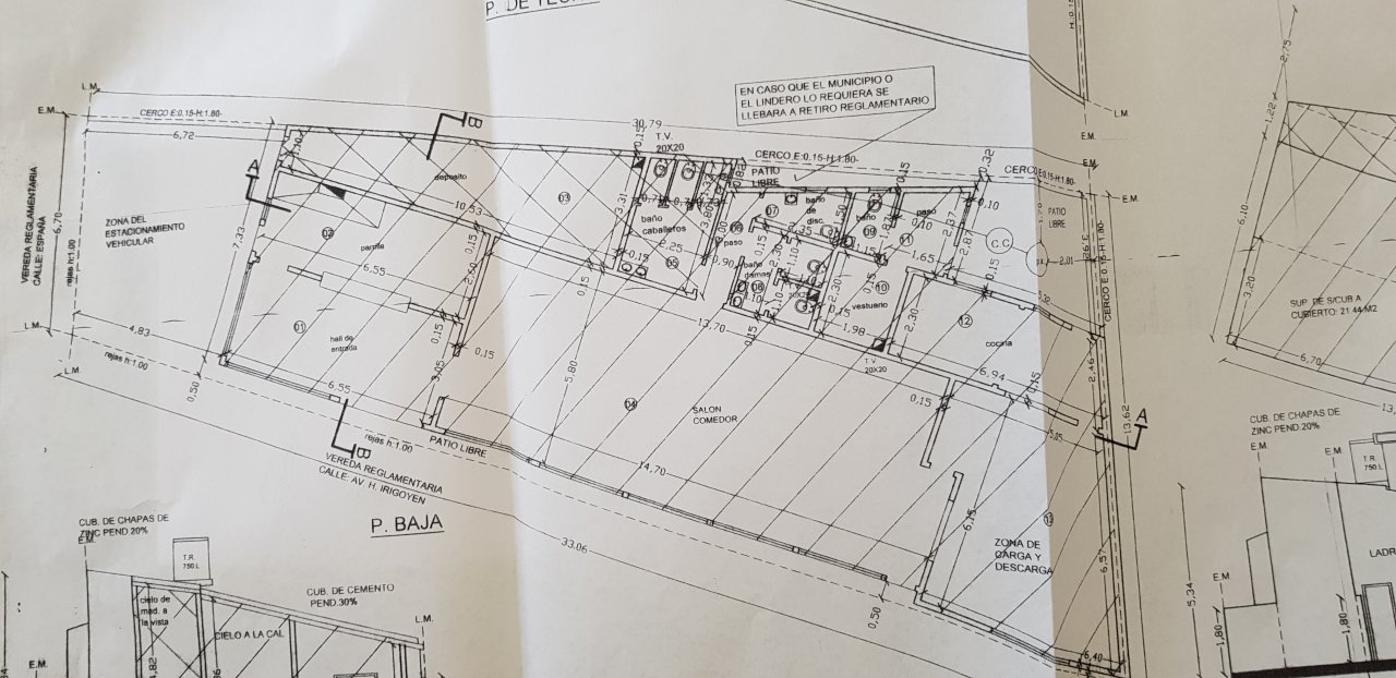 - MEDIDAS (LOTE IRREGULAR): 33,06 m de frente sobre la Av. H. Yrigoyen, 6,70 m de frente sobre la calle España, 30,79 m en el contrafrente de Av. H. Yrigoyen, y 13,72 m en el contrafrente de España.